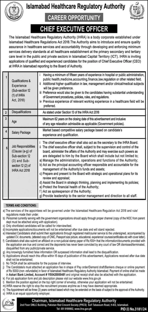 Islamabad Healthcare Regulatory Authority (IHRA) is inviting applications for the position of Chief Executive Officer (CEO). This is a senior leadership role aimed at overseeing the administration and ensuring healthcare quality standards in Islamabad. The position is ideal for highly qualified professionals with substantial experience in healthcare, public health, or related fields.